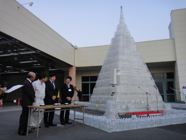 12月23日(木)、東温市クールスモール北出入口・北駐車場にて、2010年ペットボトルイルミネーションタワー点灯式が開催された。この日を迎えるまでには数々の物語が用意されていた。そう、すべてはたった1本の先輩からの電話が物語の始まりだった・・・。「一緒に手伝ってもらえんやろか?」、先輩からのその一言に「ええですよ!」と、私は答えたのであった。それから中田部長、そして篠浦常務、髙木部長、井上課長へと伝播され、さらにはマルトメ協力会社の株式会社須賀組様、オオノ開發株式会社様へと輪が広がり、本日のこの日を迎えることができたのである・・・。そして日も沈んだその時、東温市クールスモールの光となるペットボトルイルミネーションタワーの点灯式が、4人の手によって執り行われたのであった・・・。