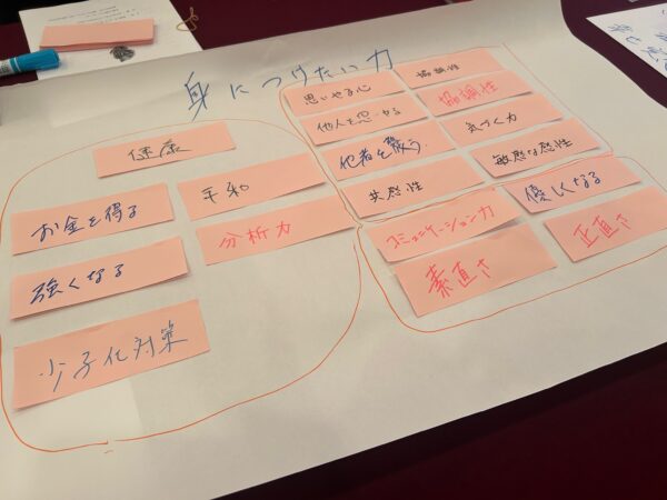 各グループに分かれて、リーダー、発表・報告、記録、時間、道具・準備の5人が決定し、それぞれにそれぞれの役割を果たす中で、「どんな社会になりたいか?」「身につけたい力」を話し合い、まとめて発表された。
