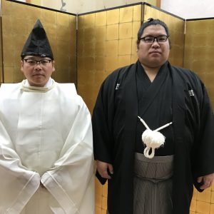 伊勢ノ海部屋の錦木関とのツーショットからはじまり、厄除け神事から弓打ち、旧正月に訪れる悪霊である鬼を退散させる為の豆打式を執り行い、集まった皆様へ福(お菓子や豆・餅)を巻いた。妻をはじめ子どもたちも満足してくれたようだ。豆打式後の直会においても、おいしい料理とお酒を囲みながら笑顔と笑いが椿会館(舟山塾)から波紋のように広がっていったのであった。お世話になった皆様、今日は貴重な機会をいただきまして、本当にありがとうございました。
