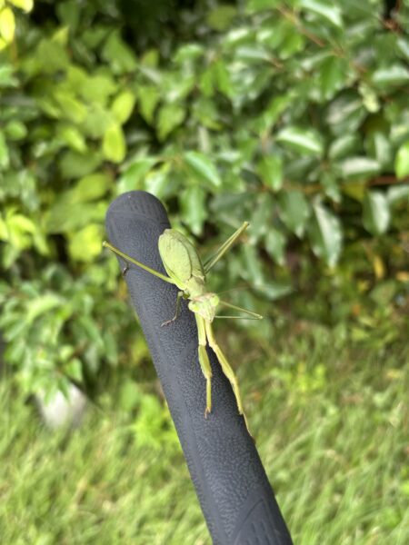 前半最終の9番ホールのティーイングエリアに存在した大カマキリを発見し、戯れる余裕さえあった私・・・。今日はコイツのおかげでハギノ式を制することができたのであった。また頼むよ。