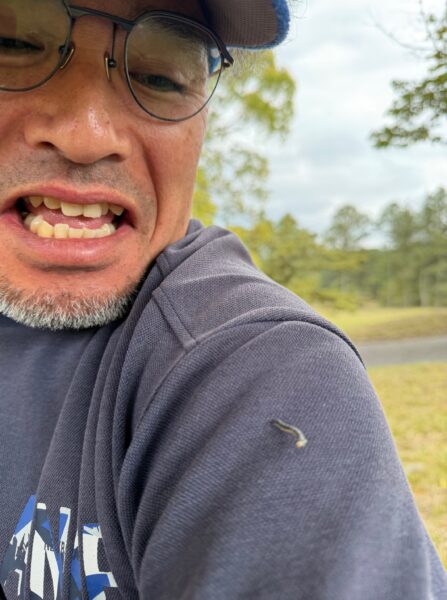 クロマニヨンの肩に突然上から降臨した尺取虫・・・。コイツが肩についたおかげで、エリエール名物の池17番ロングホールでバーディー・パー・パー・パーの好成績を出すことに成功した。マジキモス。