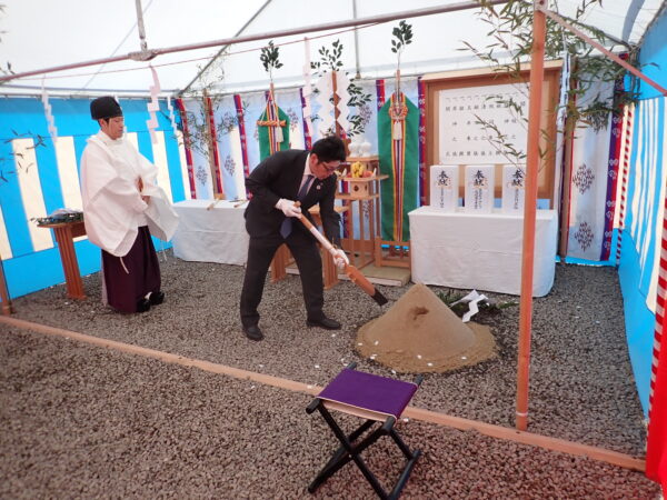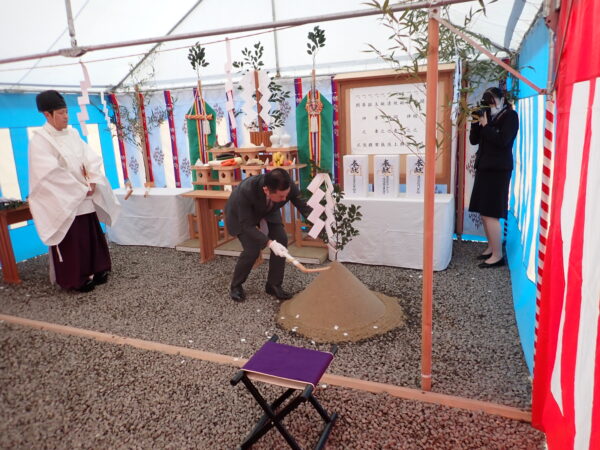 設計・監理者が執り行う忌鎌(いみかま)、お施主様の忌鍬(いみくわ)、施工者による忌鋤(いみすき)が執り行われた。