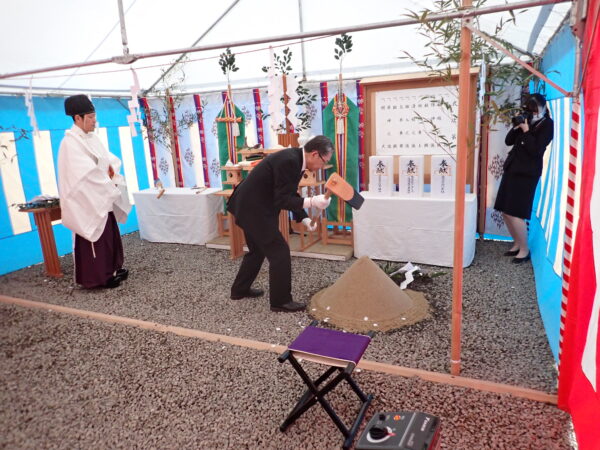 神事は、工事の安全をお祈りする祝詞奏上、次に設計・監理者が執り行う忌鎌(いみかま)、お施主様の忌鍬(いみくわ)、施工者による忌鋤(いみすき)が執り行われる。結びに、玉串(たまぐし)を奉奠(ほうてん)し、2礼2拍手1礼にて安全を祈願をする・・・。最後に斎主様の乾杯の音頭により、工事に関わる全ての皆様と共に、工事の安全とご健康とご多幸を祈念して神酒拝戴を執り行った・・・。こうして、広島市信用組合 戸坂支店新築工事の地鎮祭を滞りなく執り修めることができたのであった。