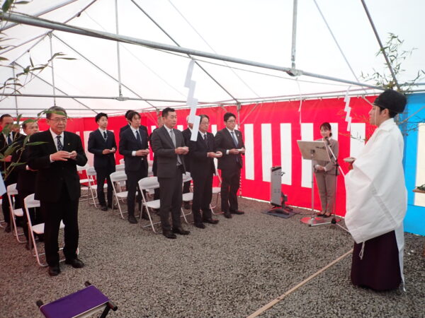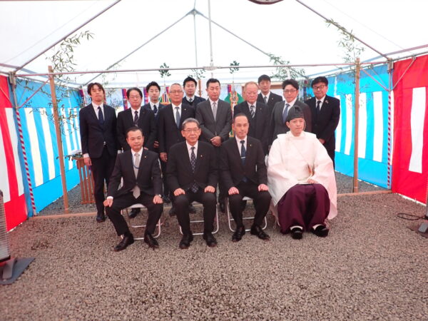 本日は、広島市信用組合 戸坂支店新築工事の地鎮祭を滞りなく執り修めることができましたこと、誠におめでとうございます。心からお慶びを申し上げます。また、2024年8月26日に竣工を迎えた広島市信用組合 薬研堀支店に引き続いて御指名賜りましたこと、心から感謝申し上げます。これから、設計・監理であります最強パートナーの株式会社クマヒラ一級建築士事務所様の下、安全衛生・品質管理を徹底し、綿密な協力態勢で施工に取り組んでいきたいと思います。また、現場監督であります宮脇所長を筆頭に、お施主様に満足と感動していただける広島市信用組合 戸坂支店が提供できるように、現場一丸となって安全施工に取り組んで参りますので、今後ともよろしくお願い致します。