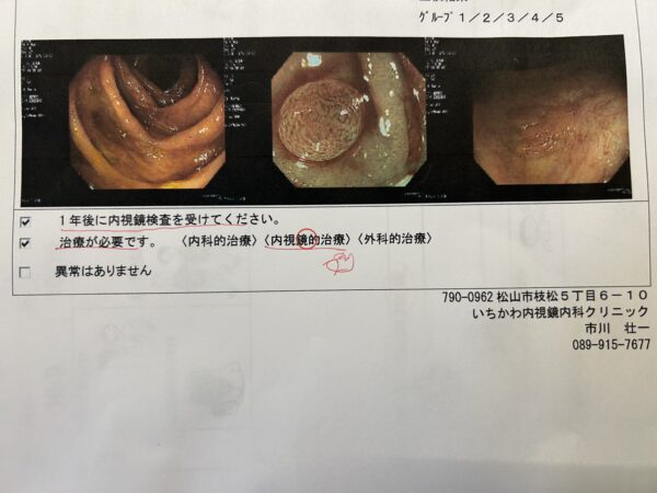結果は1/3の付近にあった3㎜のポリープと、昨年と同様に直腸に15㎜のポリープがあった。直腸のやーつは、姿や形も昨年とまったく同じく、どうやら昨年切り取ったやーつの一部が残っていたのでは・・・との見解だった。いずれにしても、1年後の今年にやっといて良かったことが判明した。皆さんも、辛そうなイメージの大腸内視鏡検査ですが、一瞬の出来事なんで自分の身は自分で守るの意気込みで、自身の大腸と向き合っていただきたいと思います。健康一番。