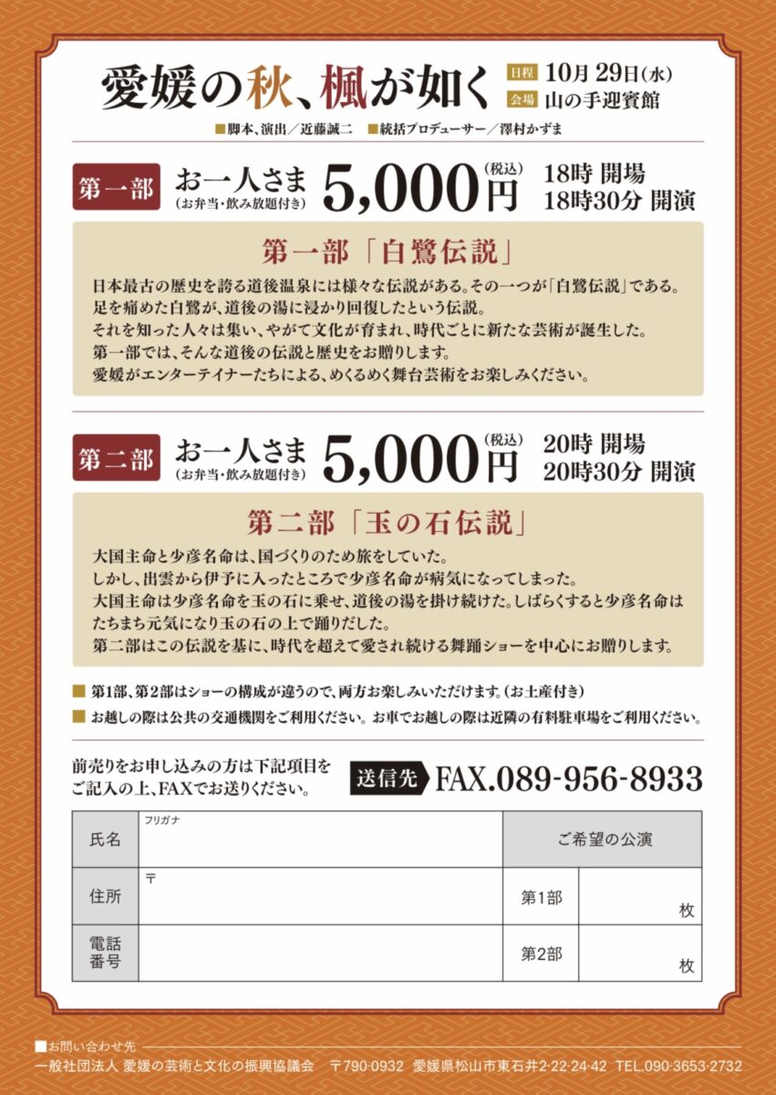 P.S.:秋天一碧~伝統芸のナイトタイムエンターテインメント~「愛媛の秋、楓が如く」のお申込み入力フォームはこちらになります。