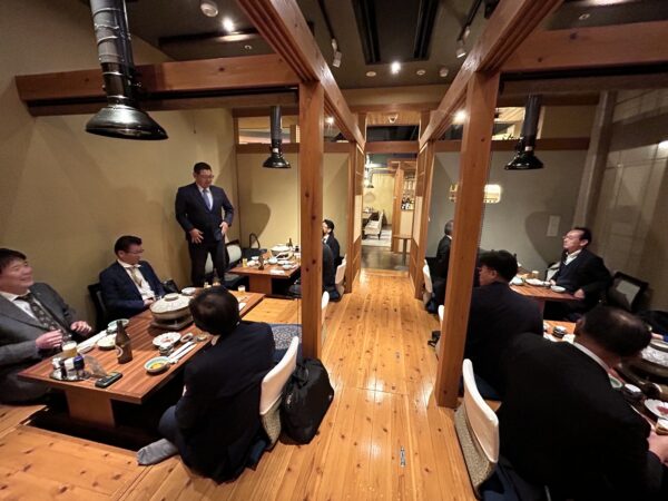 第1回委員長会議が終了し、海鮮焼き 雲丹しゃぶ吉長にて、懇親会を行った。懇親会の開催に先立ち、腹パンアリーナ総務企画委員長より乾杯のご挨拶が行われ、今日しか味わえない人と人、人と地域、人と同友会との連携を祈念する乾杯が行われたのであった。