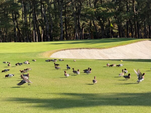 170ヤードある日南コース7番ショートホールのグリーン手前に、無数のカルガモ群を発見した私たち・・・。必死でグリーン前の芝を突きまくっていた。そこには、かなりの量の糞が落ちていた。全員グリーンオンすることができたが、私のみスリーパットでボギーとなった。