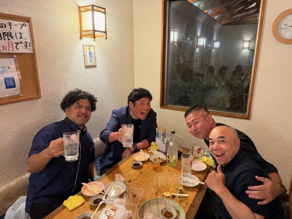 スイーツカフェ「かんな+plus」で富山の巨神兵と別れを告げて、パイチンパグちゃんレンタカーは金武町へと向かった。私のNBUラグビー部の仲間たちと、金武町の居酒屋じんじんで懇親を深め合った。サイコーのウチナータイムにあっり乾杯!となった。