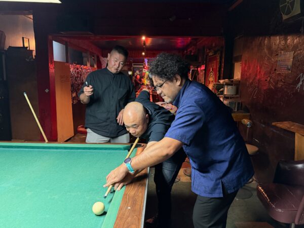 居酒屋じんじんでは、豚の血を煮込んだ命薬料理「チーイリチャー」をはじめ、金武町発祥のタコライスを堪能することができた。また、居酒屋じんじんからの2次会では、アメリカンスタイルのBarに訪れ、ビリヤードからダーツを楽しむことができた。パイチンパグちゃん、はじめてのビリヤードだったみたいで、しまぶーとヤスに指南されていた。いい経験になったな、パグちゃん。最高の沖縄金武町ナイトをありがとう。