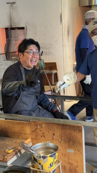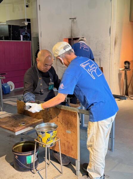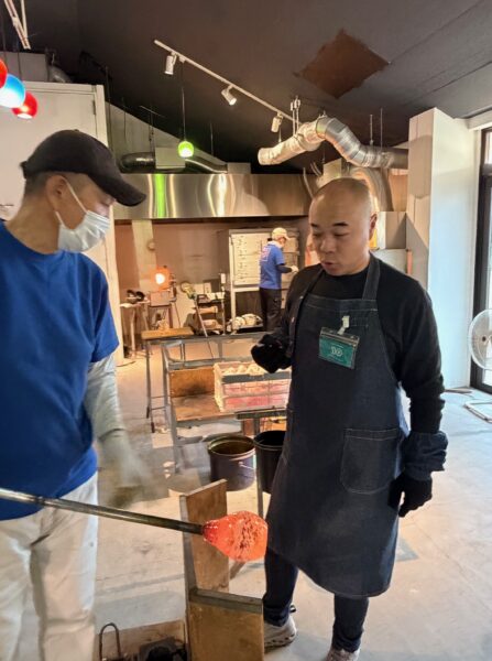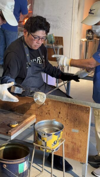 ぷぅ~とガラスに息を吹き込む工程をはじめ、グリグリとガラスの広げる工程を行った私たち・・・。息吹き込むやーつは、昨夜からの二日酔いのせいで、かなり血圧が上がった。また、右手で鉄棒持って、左手でグリグリするやーつは、右手に力が入り過ぎてなかなか上手くやれなかった。この右手の力が多分パッティング時のゆらゆらイップスにつながっていると思った。力入り過ぎ!