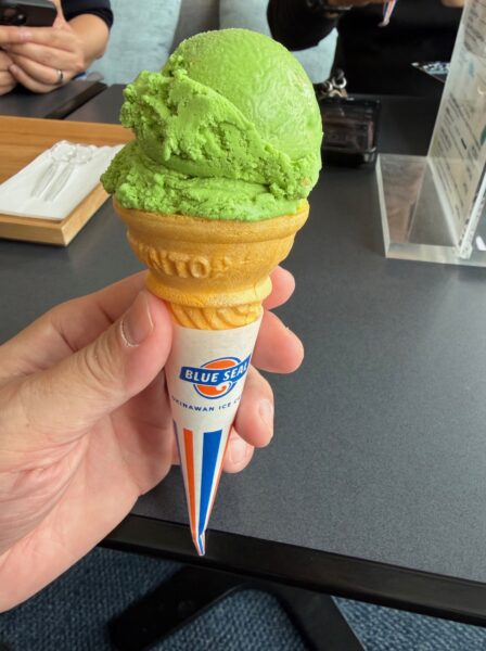 琉球ガラス制作体験後に、沖縄のアイスブランド「ブルーシール」をご馳走になった私たち・・・。私はアーモンドピスタチオをチョイスして、作り終わった達成感と共に、二日酔いの頭ズキズキにかなり効いた。何から何までおもてなしをいただき、心から感謝申し上げます。琉球ガラス村、サイコーっす。