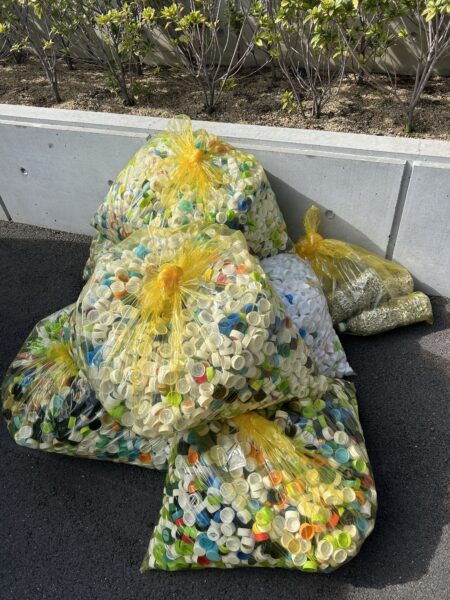 今期初となる門屋組の各現場で集めてもらったペットボトルのキャップ巨袋7袋並びにプルタブたくさんをYイマジョーの元へ届けることができた。現場でいつも集めてくれている皆さん、本当にありがとうございます。門屋組ではSDGsの一環として、自動販売機から出たペットボトルのキャップ及びアルミ缶のプルタブ回収運動を行っています。ペットボトルのキャップを集めることにより、リサイクルの促進をはじめカーボンニュートラルを鑑みたco2削減に寄与するとともに、キャップの売却益による世界の子どもへのワクチン寄付にもつなげることができます。またアルミ缶のプルタブ回収運動は、回収されたプルタブが約800kgを超えるとアルミ製車椅子1台に変わり、必要とされる方々に贈呈される運びになっています。これらのSDGsを通じて、これからも持続可能な社会に向けた運動を継続してまいります。