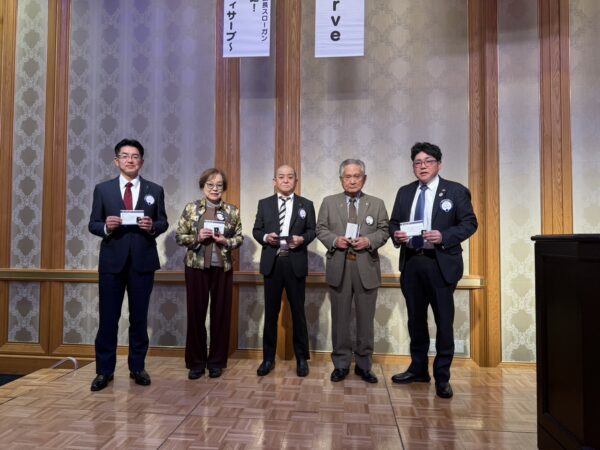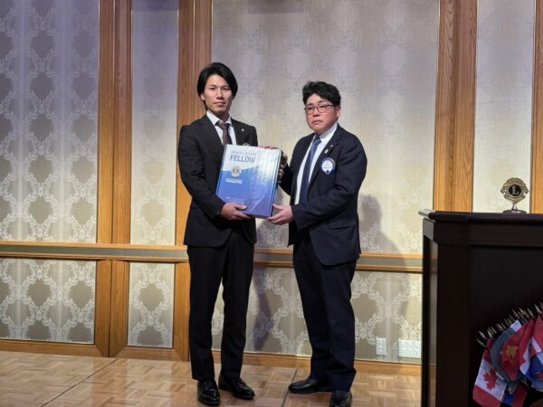 累進MJF1000$寄付のバッヂ贈呈を行った。11回という最高累進者となるL516さんより一言いただいた。世のため人のためにつながっていくことを願います。