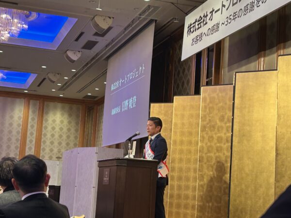 心温かな来賓祝辞を、株式会社ナッツ代表取締役(荒木 賢治 氏)、松前町長(田中 浩介 氏)、衆議院議員(塩崎 彰久 氏)、株式会社OK自動車 代表取締役(東山 雅彦 氏)、東昇技建株式会社 代表取締役(小泉 啓典 氏)より賜り、会場内は一気に35周年への思いが一つになる・・・。そして、本日サプライズの息子の社長就任と共に、株式会社オートプロジェクト創立35周年の節目の時を迎え、未来を見据えたオートプロジェクトの次なる目標に向けて前へと進めたのであった。