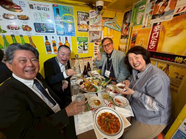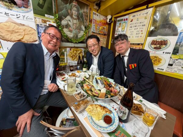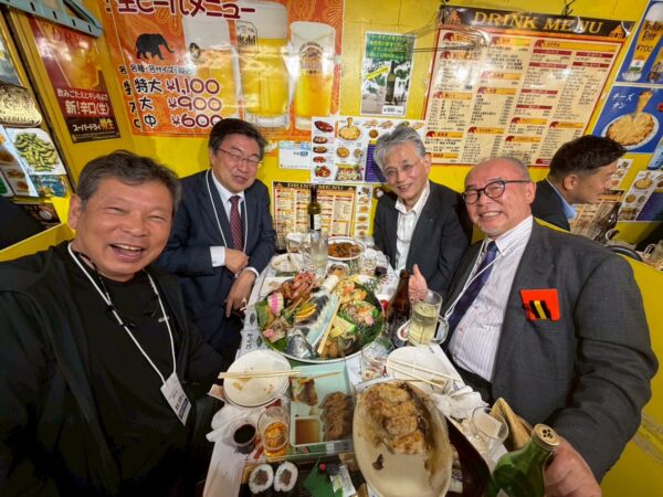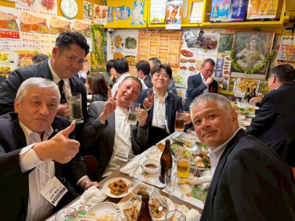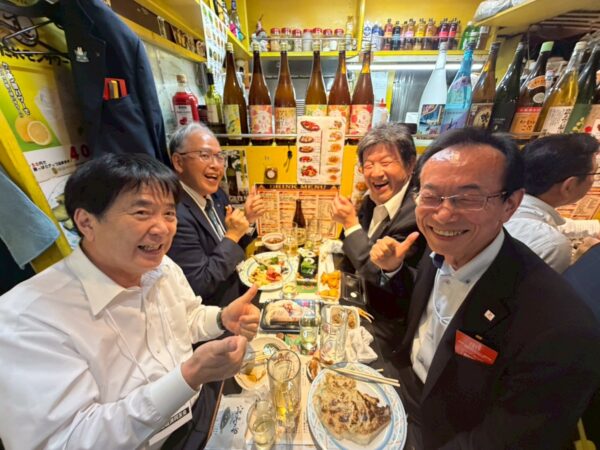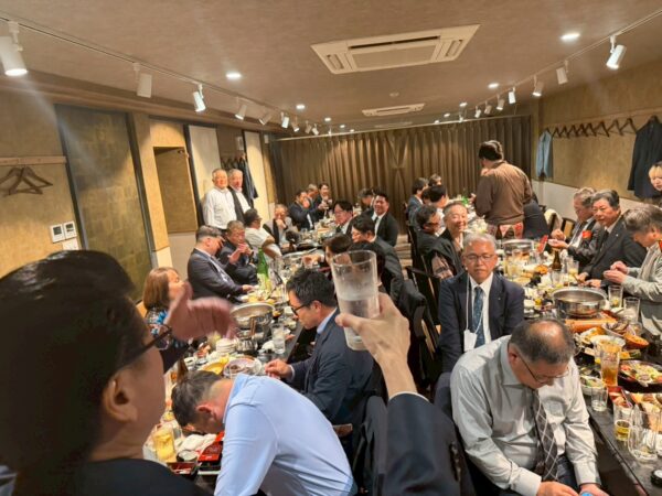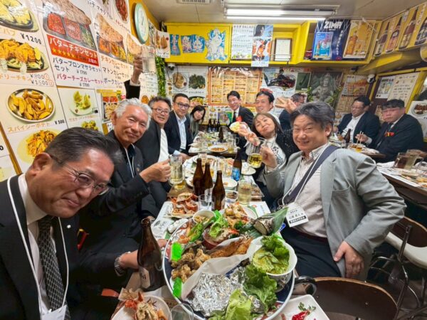 0次会のひろめ市場を堪能し、2次会となる長宗我部へとやってきた。50人を超える愛媛経済同友会の2次会は、これまでにない異様な盛り上がりを見せていた。コイニー副代表幹事の乾杯の音頭で輝かしく幕が開けた。