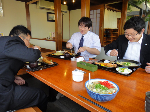 梅雨入りを宣告されてるにも関わらず、「何じゃこれは?」と言わんばかりの大晴天の中、瀬戸内の景色と海風を感じながら今治の地を目指そうと、吉田号は颯爽と国道196号線を駆け抜ける・・・。車の中は、昨晩のアルコール摂取で二日酔いに見舞われた大谷委員の体から酒の香りが生まれてくる・・・。匂いに敏感な吉田幹事がすぐさまにその匂いを感知したことで、車内はよくわからないが笑顔と笑いに包まれたのである。そんなこんなもありながら、ちょうど昼食時を迎えたので、駄場元副グループ長の思い出のレストラン(ぎやまん亭)で腹ごしらえすることにした・・・。ここで食欲を満たした私たちは、愛媛ブロック会員大会式典並びに記念事業が開催される今治地域地場産業振興センターを目指したのであった・・・。
