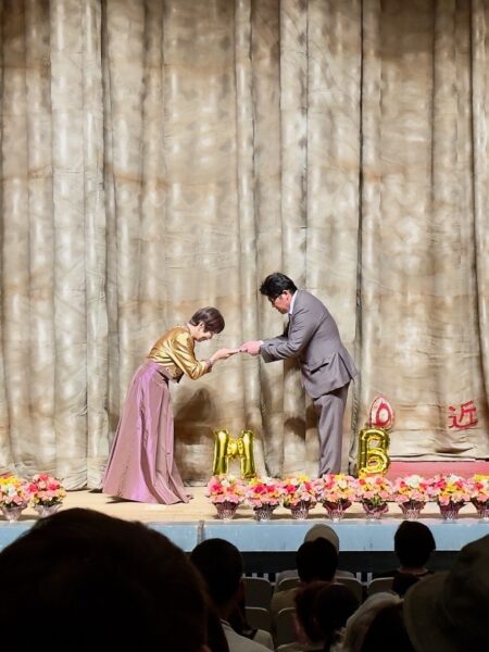 松山道後ライオンズクラブより、松山少年少女合唱団の阪本先生へ、支援金が贈呈された。今年の支援金は、松山道後ライオンズクラブ 結成65周年記念仕様となっている。有意義にお使いください。