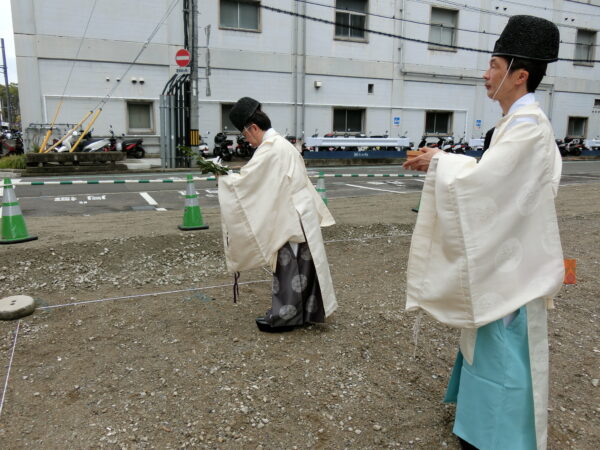 神事は工事の安全をお祈りする祝詞奏上、設計監理による株式会社共立エステート並びに株式会社イクス・アーク都市設計による忌鎌(いみかま)、施主となる門屋組不動産の代表(門屋 光彦)による忌鍬(いみくわ)、斎主様による鎮め物埋納の儀、施工者として水野副社長による忌鋤(いみすき)が執り行われた。