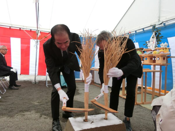 神事は工事の安全をお祈りする祝詞奏上、設計監理による株式会社共立エステート並びに株式会社イクス・アーク都市設計による忌鎌(いみかま)、施主となる門屋組不動産の代表(門屋 光彦)による忌鍬(いみくわ)、斎主様による鎮め物埋納の儀、施工者として水野副社長による忌鋤(いみすき)が執り行われる・・・。そして、玉串(たまぐし)を奉奠(ほうてん)し、2礼2拍手1礼にて安全を祈願をする・・・。結びに、斎主様の乾杯の音頭により、工事の安全とご健康とご多幸を祈念してポンジュース拝戴を執り行った・・・。こうして、(仮称)野乃松山(松山市二番町ホテル)計画新築工事の起工式を滞りなく執り修めることができたのであった。