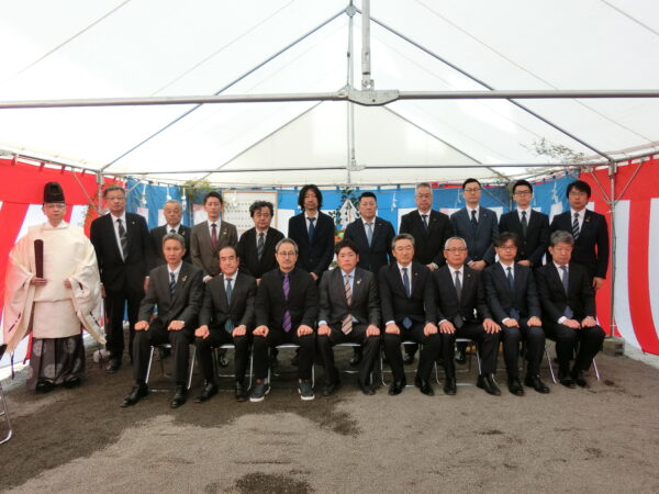 伊豫豆比古命神社宮司様より雨降って地固まる有難いお言葉を賜り、工事に関わる全ての皆様と共に、工事の安全を祈念してポンジュース拝戴を執り行った。これから、設計監理による株式会社共立エステート並びに株式会社イクス・アーク都市設計と門屋組によって、我がまちの100年先の未来を見据えた地図に歴史に人の心に留まる野乃松山の施工に臨みますが、協力会社一丸となって安全・品質・衛生管理に取り組んでいきます。近隣地域の皆様、騒音等でご迷惑をお掛けしますが、引き続きよろしくお願い申し上げます。