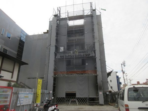 伊予鉄高島屋永代町別館新築工事の現場では、型枠工事が行われていた。安全通路の確保と共に、現場入場者への快適職場環境の形成をよろしくお願いします。今後ともまだまだ続く熱中症対策を万全に、危険予知とリスクアセスメントの強化をお願い致します。