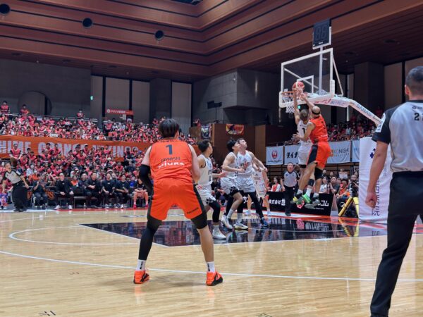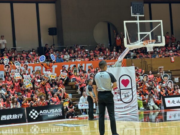 GOGOバイクス!と熱烈応援はコミセンいっぱいに溢れかえる・・・。前半戦はベルテックス静岡にリードされ、苦しい戦いが余儀なくされたが、ダンクシュート・スリーポイントシュートを決め、結びには俊野選手が同点へと導き、マット・ハームス選手が逆転のフリースローを決めてくれた。79-76という3点差劇的逆転勝利を収め、コミセンいっぱいにオレンジ色に染まりまくった多くの観戦者と共に勝利を分かち合った。こうして、両チームの闘志と闘志がぶつかった白熱の闘いと、サンキュー卵プロジェクトを実施できる瞬間、そして熱い熱い門屋組ブーストゾーンを見届けることができた。本日の素晴らしい試合を観戦できたことに心から感謝します。本日はありがとうございました。