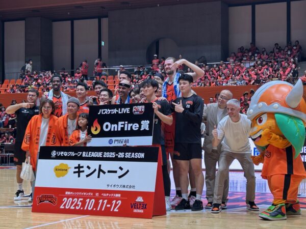 79-76で見事に逆転勝利を収めた愛媛オレンジバイキングス・・・。勝利後は、今期初の試みとなる門屋組プレゼンツOnFire賞の門屋組法被に纏って栄誉が称えられた。
